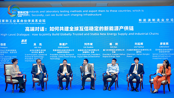 在分論壇的高端對(duì)話環(huán)節(jié),星云股份副董事長(zhǎng)兼總裁劉作斌與行業(yè)企業(yè)、專家學(xué)者、機(jī)構(gòu)代表等同臺(tái)分享。星云股份近年來(lái)積極響應(yīng)金磚合作倡議,拓展包括印度在內(nèi)的金磚國(guó)家市場(chǎng),并通過(guò)領(lǐng)先的鋰電池檢測(cè)產(chǎn)品與服務(wù)、電池智能制造解決方案、充檢一體設(shè)備等,持續(xù)為金磚國(guó)家新能源產(chǎn)業(yè)鏈發(fā)展提供關(guān)鍵技術(shù)支持。劉作斌總裁主張通過(guò)建立全球統(tǒng)一的技術(shù)標(biāo)準(zhǔn)與認(rèn)證互認(rèn)體系來(lái)共建互信穩(wěn)定的新能源產(chǎn)供鏈,并通過(guò)將高精度、高可靠性的檢測(cè)數(shù)據(jù)作為行業(yè)的“通用語(yǔ)言”,實(shí)現(xiàn)從“電芯→模組→PACK”全生命周期的質(zhì)量可追溯、可驗(yàn)證,打破不同國(guó)家之間在新能源領(lǐng)域的技術(shù)壁壘與信任隔閡,讓電池的安全與性能成為全球市場(chǎng)互認(rèn)的“硬通貨”,最終推動(dòng)新能源產(chǎn)業(yè)在透明、協(xié)作、互信的基礎(chǔ)上實(shí)現(xiàn)高質(zhì)量可持續(xù)發(fā)展。